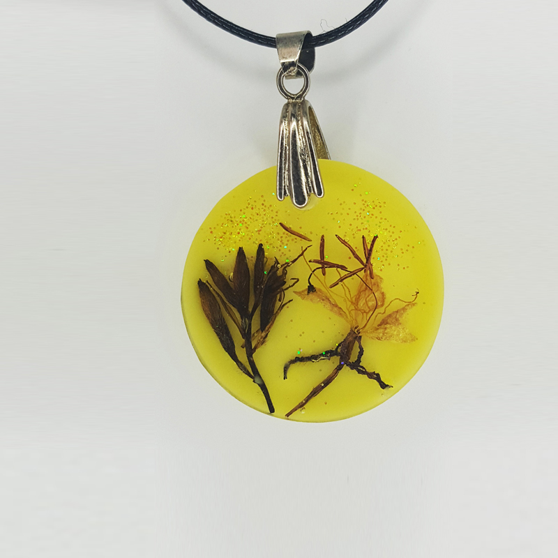 Elle toplanan çiçekleri özenle kurutarak ve reçine ile birleştirerek meydana gelen eşsiz tasarıma sahip kolyeler.Tamamen el yapımı bu süreçte itina ile hazırlanmıştır. Uzun ömürlü olmasıyla birlikte UV ışınlarına maruz kalması durumunda sararma solma gibi deforme olmaz.Bu sebeple yıllarca eskimeden kullanılabilir. Kolay silinebilir, yıkanabilir, temizlenebilir özelliğine sahip (Kimyasal madde ile temizlemeyin!). Kore ipi kullanılmıştır ve parlak görünüme sahiptir. etmez tahriş yapmaz.